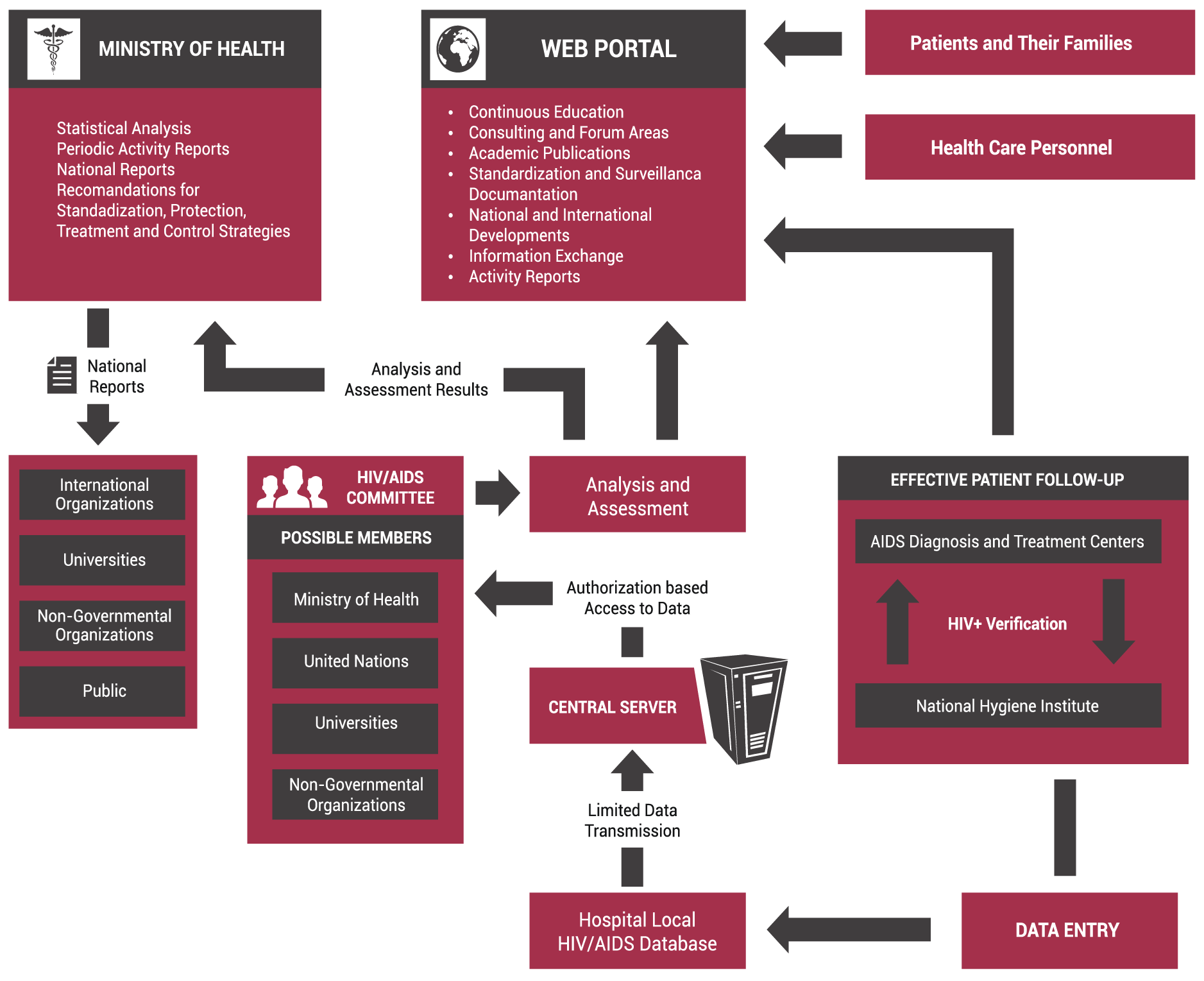 HIVOnline is a web-based surveillance software that enables registry and reporting of data on HIV/AIDS cases in local, regional and national scales, without exposing patients’ personal information. Adoption of HIVOnline will provide an HIV/AIDS early warning mechanism through monitoring of epidemics, patient treatment and drug resistance. Evaluation of its surveillance data will help to develop national policies for disease prevention, educational programs and public awareness. Besides surveillance, HIVOnline can follow up the treatment of HIV patients effectively and contribute to an increase in the patients’ quality of life. HIVOnline is a national surveillance system to be used to collect HIV data by prophylaxis centers, local health centers, state, private and university hospitals throughout the country and to submit statistical results to the national health authority. It can sort out the infection sources of risk groups and follow-up the long term trends.